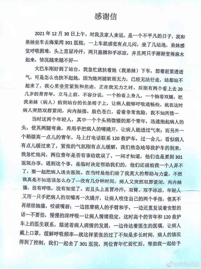 【两千字长文,只为致谢救人不留名的海军战士】近日,南部战区海军航空兵某团收到一封感谢信,语言朴实却又真情流露,读罢让人不禁为信中突发疾病的女士捏一把汗,又为关键时刻挺身而出,又悄然离去的两个年轻人点赞。原来,2021年12月30日上午,该团战士王中海、黄珂禹在归队途中发现公交车上一名中年女子面色发白、呼吸困难,没有半点犹豫,二人立即实施应急处置, 救护车到来后,又陪同女子至医院治疗,直到患者家属到达后两人才放心离开。事后,经过多方打探,崔女士及家人一行三人专程到该团某大队,向救命恩人当面致谢。(王子木 赵振宇)#比心中国军人#