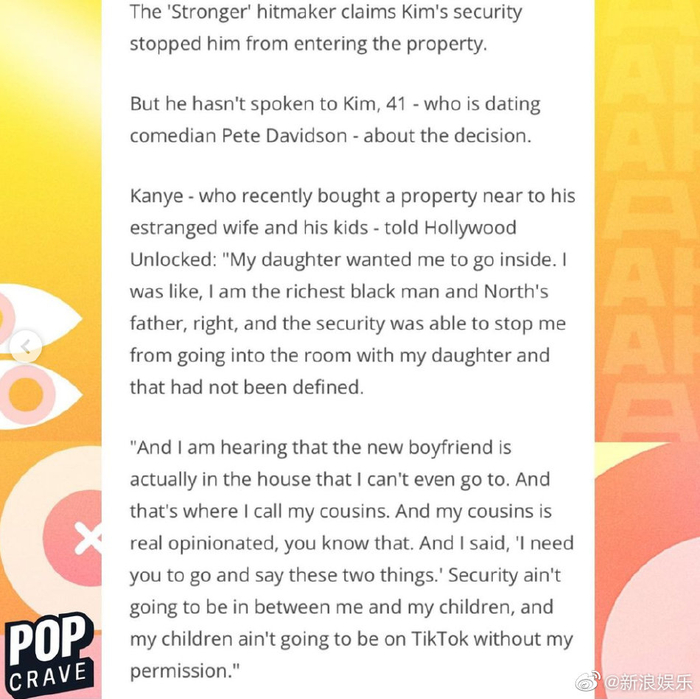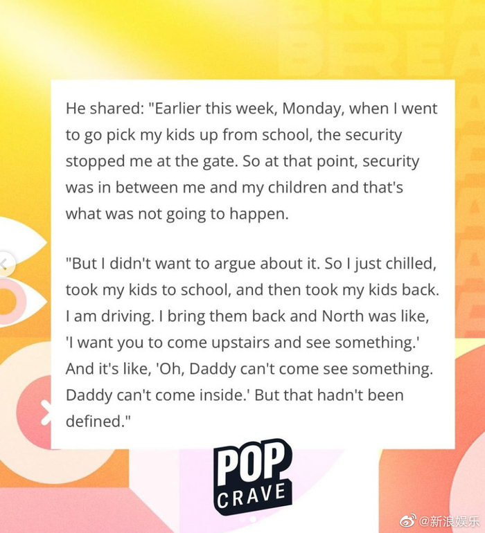 #侃爷称卡戴珊不准他探视女儿# 近日,侃爷Kanye West在采访中称前妻金·卡戴珊Kim Kardashian不允许他前往她家探视女儿。“我女儿想让我进去。我当时想,我是最富有的黑人,也是North的父亲。可是保安阻止了我和女儿一起进入屋里”。1月7日,侃爷公开了与新女友Julia Fox的恋情。