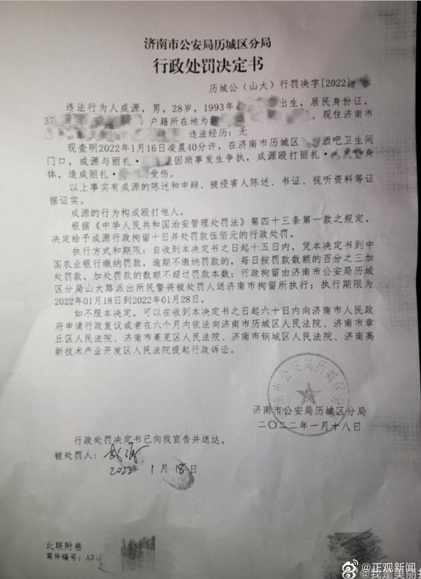 #球员成源殴打他人被拘10日#【球员成源殴打他人,被打女子晒警方处罚决定书:拘留10天】该博主称,打人者为前鲁能球队的球员成源 近日,球员成源殴打女生一事引起舆论关注,1月18日,被殴打的当事女生更新微博,晒出济南历城警方对成源的行政处罚决定书:成源被判行政拘留十日,并处罚款500元。 正观新闻此前报道 1月17日,微博网友@我是美丽扎 发微博称,1月16日凌晨12点许,她在济南市么哈酒吧的厕所门口被一男子碰撞,但该男子并未道歉,并殴打辱骂。该网友称,报警后,酒吧的保安将他抓回后,该男子仍扬言,“知道我是谁吗?我是鲁能的。” “酒吧的厕所门口,他酒后撞到我差点摔倒在地上并且用脏话骂我,我追过去要求他給我道歉,对方指着我鼻子跟我说,小姑娘刚出社会吧?不知道社会的险恶是不是?你知道我是谁吗就敢这样跟我说话?”该博主称。 该博主发文称,男子骂了她后,又扇了她一巴掌,随即拽着她的头发就往水池子里撞,狠撞了几次后,把她扔到在地上,对她的头猛踹几脚,又揍了几拳。打完她之后,男子便走了,该博主随后报警。 “警察来的时候,他还跑了,最后是酒吧的六个保安把他抓回来,他还对在场所有人说,知道我是谁吗?我是鲁能的。”该博主称,派出所也在做完笔录之后将该男子放了出来。 该博主称,目前她现在面部头部创伤和肿胀,左半边脸已经做不了任何表情,僵硬状态,头部也已有两块肿起来,吃不进去东西,头晕脑胀,左眼已经看不清东西,左眼眉骨已经肿起来,右边耳朵后面的耳骨已经肿了,脖子挫伤,双手美甲掉了四只,右边膝盖上侧青紫了,右嘴唇里面的肉也有创伤。 该博主称,目前了解到打人者为前鲁能球队的球员成某,不久前转入青岛海牛足球俱乐部。但成某在微博认证仍为山东鲁能球员,其本人也并未在微博回应此事。 据了解,山东鲁能泰山足球俱乐部,简称鲁能队或者泰山队,是一支位于山东省济南市的足球队。2022年1月4日,山东泰山队以总积分51分夺得2021中超联赛冠军; 1月9日,山东泰山1-0战胜上海海港,夺得2021足协杯冠军,加冕赛季双冠王。 1月18日,正观新闻记者多次拨打青岛海牛足球俱乐部电话,但一直并未接通。其官方微博也并未对此事进行回应。1月17日,红星新闻致电山东鲁能泰山足球俱乐部,相关负责人表示,“现在还在进一步核实当中,还在了解过程中,正在处理。”至于是否会对成源作出相应处罚,相关负责人表示,“还需要根据具体的情况。