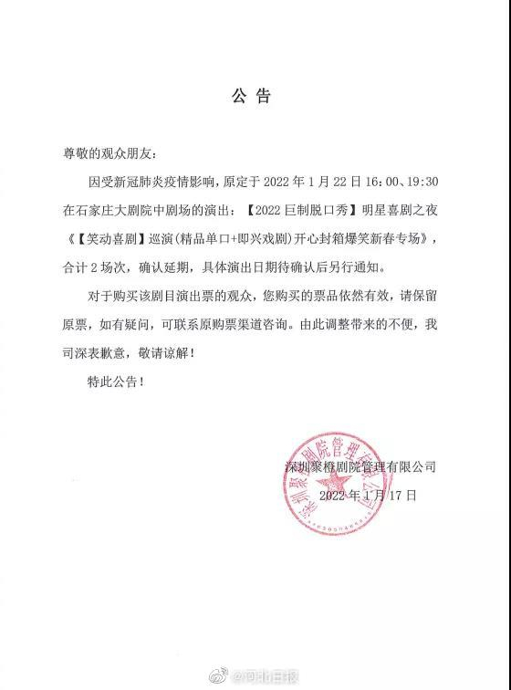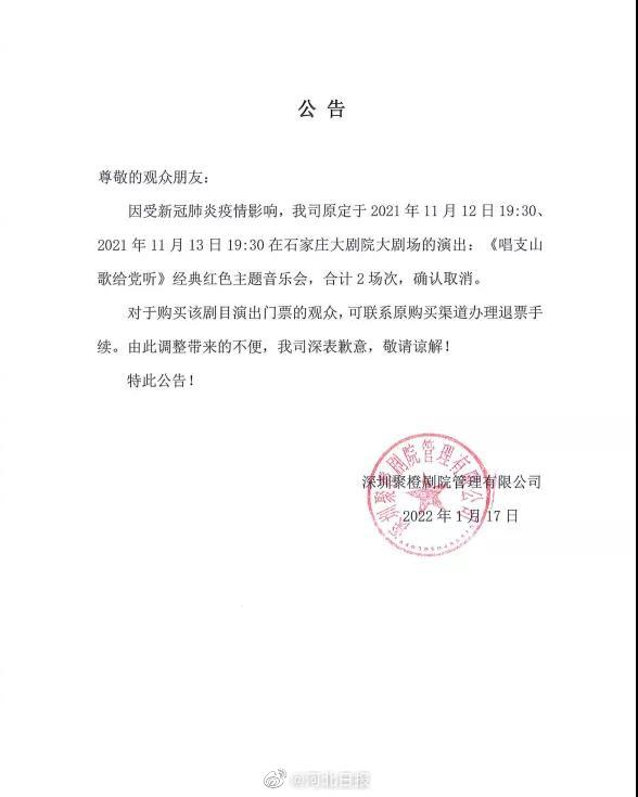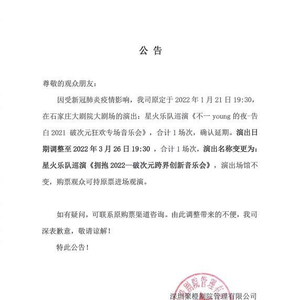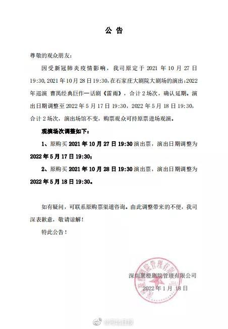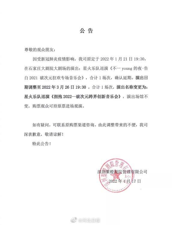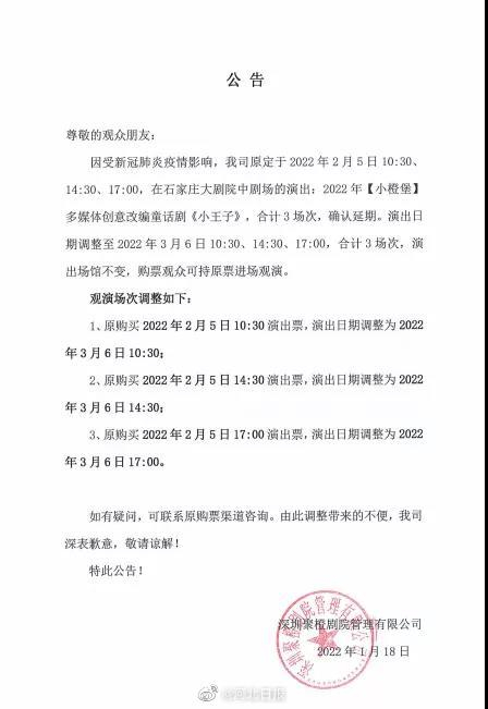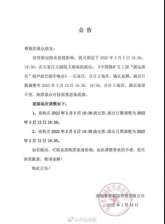 【#石家庄大剧院部分演出项目取消及延期#】1月18日,石家庄大剧院发布公告,因疫情原因,石家庄大剧院部分演出项目取消及延期,具体如下↓↓↓ 2022年1月21日19:30在石家庄大剧院大剧场演出:星火乐队巡演《不一young的夜-告白2021 破次元狂欢专场音乐会》,确认延期,演出日期调整为2022年3月26日19:30,演出名称变更为:星火乐队巡演《拥抱2022—破次元跨界创新音乐会》,演出场馆及座位不变。 2022年1月22日16:00、19:30在石家庄大剧院中剧场演出:【2022巨制脱口秀】明星喜剧之夜《【笑动喜剧】巡演(精品单口+即兴戏剧)开心封箱爆笑新春专场》,确认延期,具体演出日期待定。 2021年11月12日19:30、11月13日19:30在石家庄大剧院大剧场演出:《唱支山歌给党听》经典红色主题音乐会,确认取消。 2022年2月5日16:30、19:30在石家庄大剧院大剧场演出:《中国煤矿文工团“源远流长”相声曲艺新年晚会》-石家庄站,确认延期,演出日期调整为2022年3月12日16:30、19:30,演出场馆及座位不变。 2022年2月5日10:30、14:30、17:00在石家庄大剧院中剧场演出:【小橙堡】多媒体创意改编童话剧《小王子》,确认延期,演出日期调整为2022年3月6日10:30、14:30、17:00,演出场馆及座位不变。 2021年10月27日、28日19:30在石家庄大剧院大剧场演出:曹禺经典巨作——话剧《雷雨》,确认延期,演出日期调整为2022年5月17日、18日19:30,演出场馆及座位不变。 已购买以上石家庄站演出的购票者,在【聚橙官方渠道】购票者,可选择保留门票,在新的演出日期观看,座位维持不变,若您实在无法前往,可于工作日工作时间致电400-185-8666咨询;在【其他渠道】购票者,请联系【原购票渠道】进行票务咨询。(石家庄大剧院)[编辑|王伟]