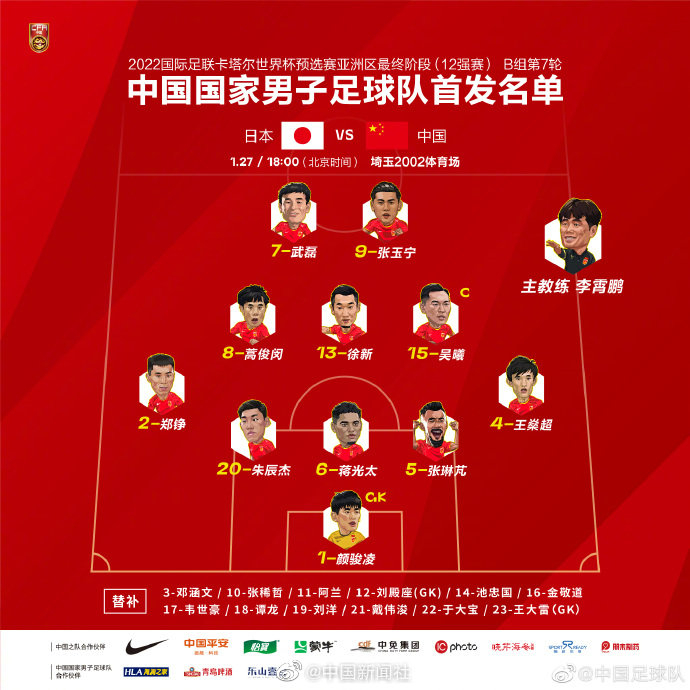 国足VS日本首发阵容公布!
