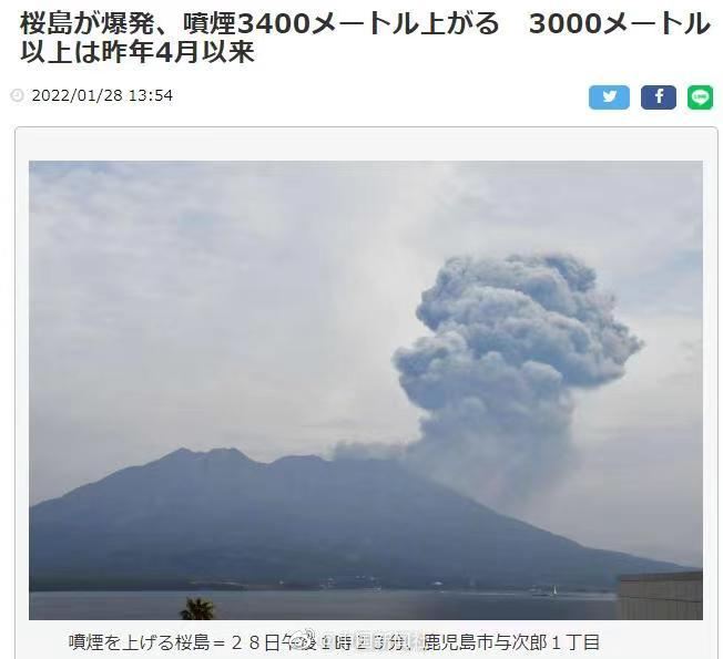 【#日本樱岛火山喷发#灰柱高度达到3400米】据《南日本新闻》报道,当地时间28日下午1时许,日本鹿儿岛的樱岛火山南岳火山口发生喷发。据鹿儿岛当地气象台称,火山灰柱达到3400米。这是自2021年4月5日以来,灰柱首次超过3000米。当地气象台表示,目前暂无地震或地壳变动等大规模喷发的征兆。气象台呼吁民众远离火山,并提醒民众在火山口约2公里范围内,注意大块火山石和碎屑流。
