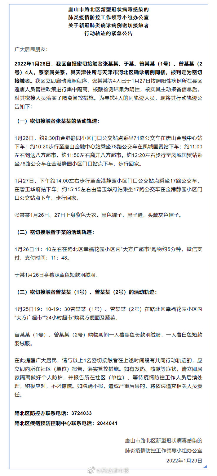 【紧急寻人!#唐山路北区公布4名密接轨迹#】1月29日,唐山市路北区新型冠状病毒感染的肺炎疫情防控工作领导小组办公室发布关于新冠肺炎确诊病例密切接触者行动轨迹的紧急公告↓↓↓ 2022年1月28日,我区自报密切接触者张某某、于某、曾某某(1号)、曾某某(2号)4人,系亲属关系,其天津住所与天津市河北区确诊病例同楼,被判定为密切接触者。我区立即启动流调程序,张某某等4人已于1月27日按照阳性病例所在县区返唐人员管控政策进行集中隔离,核酸检测结果为阴性,核实其主动报备信息后,对其密接人员落实了隔离管控措施。为寻找4人的同轨迹人员,现将其行动轨迹公告如下: (一)密切接触者张某某的活动轨迹: 1月26日,约9:30由金港静园小区门口公交站点乘坐71路公交车在唐山金融中心站下车;约10:20步行至唐山金融中心站乘坐78路公交车在凤城国贸站下车;约11:00左右到达八方超市,约11:50左右离开八方超市。约12:20左右步行至凤城国贸站乘坐78路公交车在金港静园小区门口站点下车,步行回家。 1月27日,下午约14:00左右步行至金港静园小区门口公交站点乘坐17路公交车,在碧玉华府站下车;约15:15左右由碧玉华府站乘坐17路公交车在金港静园小区门口公交站点下车,步行回家。 张某某1月26日、27日上身紫色大衣,黑色裤子,黑子鞋,头戴灰色帽子。 (二)密切接触者于某的活动轨迹: 1月26日11:40左右在路北区幸福花园小区内“大方广超市”购物约5分钟,微信支付,支付时间:11:48。 于某1月26日身着浅蓝色短款羽绒服。 (三)密切接触者曾某某(1号)、曾某某(2号)的活动轨迹: 1月25日19:10-19:30曾某某(1号)、曾某某(2号)在路北区幸福花园小区内“大方广超市”“24小时超市”购买方便面及蔬菜。 曾某某(1号)、曾某某(2号)购物期间一人着黑色长款羽绒服,一人着白色短款羽绒服。 在此提醒广大居民,请与以上4名密切接触者在上述时间段有共同行动轨迹的,应立即向所在社区(单位)报告,落实管控措施。如有发热、咳嗽等症状,请立即居家隔离做好个人防护,并报告所在社区(单位),等待疫情防控工作人员后续处理,积极应对,不必惊慌。如隐瞒不报,造成严重后果的,将依法追究相关人员责任。 路北区防控办联系电话:3724033 路北区疾病预防控制中心联系电话:2044041 (路北之声)