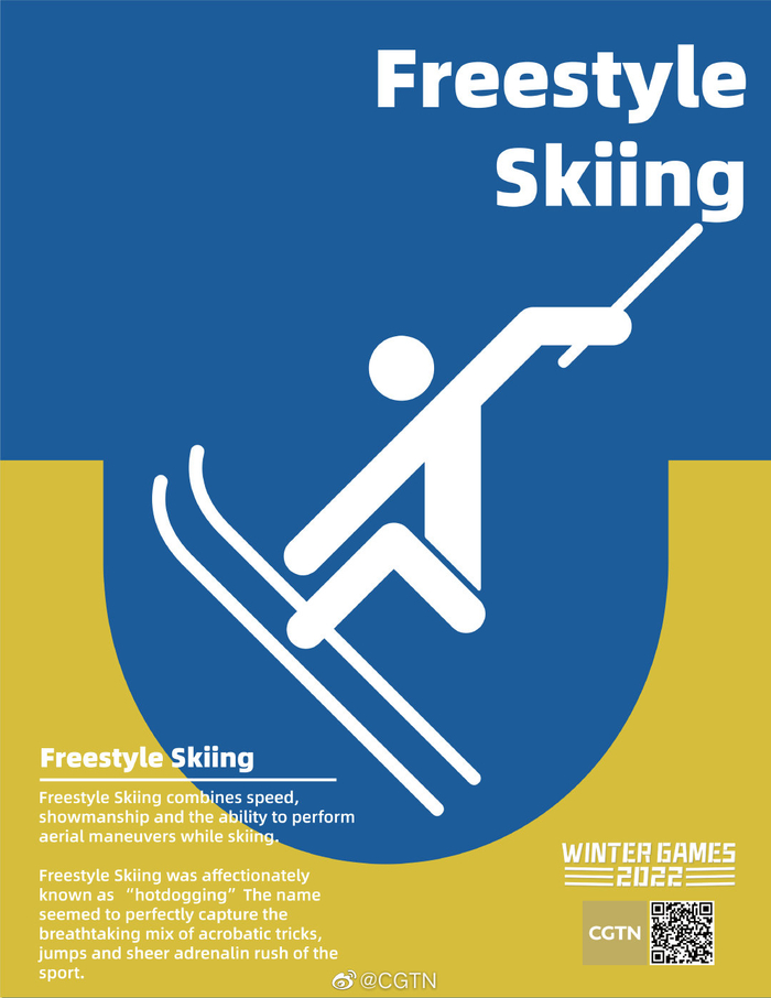 【#冬奥倒计时#18小时!来看冬奥会最惊险刺激的雪上项目——自由式滑雪】距离北京冬奥会开幕还有不到1天,你是不是已经激动地搓起了小手手?北京冬奥会共设7个大项、15个分项和109个小项,是设项和产生金牌最多的一届冬奥会。锁定CGTN,冬奥项目科普小课堂陪你一起倒计时。自由式滑雪是将高山滑雪和空中技巧相结合的一种全新的具有强烈刺激感的滑雪项目。2022年北京冬奥会,自由式滑雪比赛项目主要包含雪上技巧、空中技巧、U型场地技巧、大跳台、坡面障碍技巧和障碍追逐等13个小项。Freestyle Skiing combines speed, showmanship and the ability to perform aerial maneuvers while skiing. Freestyle Skiing was affectionately known as "hotdogging." The name seemed to perfectly capture the breathtaking mix of acrobatic tricks, jumps and sheer adrenaline rush of the sport. The Freestyle Skiing competition at #Beijing2022# will be contested on February 3, 5-10 and 13-19, with medals to be awarded in 13 events. (海报设计:冯源)