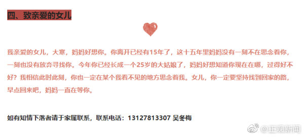 【#庐江单亲母亲寻女15年#,曾印10多万张启事张贴全国】15年前,安徽省庐江县年仅10岁的女孩吴大寒,在矾山镇杨山小学上学途中失踪,女孩的同学说,吴大寒走失那天曾和一个中年男子接触,从此女孩的母亲吴冬梅踏上了漫漫寻女之路。 近日,安徽庐江的单亲妈妈吴冬梅在社交媒体上发布视频,寻找丢失15年的女儿,“今年你已经长成一个25岁的大姑娘了,妈妈好想知道你现在在哪,过得好不好?我相信此时此刻,你也一定在某个我看不见的地方思念着我。”吴冬梅发文称。 吴冬梅称,吴大寒在1997年11月出生。 2007年6月5日下午1点左右,年仅10岁的吴大寒在安徽省庐江县矾山镇杨山小学上学途中失踪,失踪时身高为130厘米。吴大寒左眼小眼角下有一块不是很明显的小疤痕;右下眼皮里有一小痣;左脚指因小时候开水烫伤留有疤痕。 2007年6月5日,那天吴大寒身穿淡黄色带花棉绸短衣裤,绿色塑料凉鞋,背粉红色带图案书包。吴冬梅称,下午老师上课点名时,发现吴大寒不在,老师没有打电话告诉家长。到放学时间,看到别人家的孩子回来,吴冬梅并没有看到女儿回来,她便打电话问班主任,老师说,吴大寒下午没来上课,听到这消息吴冬梅一下子瘫倒在地,立马报了警。 吴冬梅称,事情发生的第三天,吴大寒同校的一名二年级小女孩说,6月5日那天中午,她看到一名中年男子跟在吴大寒后面,吴大寒当时走路东倒西歪,男子叫吴大寒爬学校边上的坡,吴大寒爬不上去,中年男子把她背上去后就看不见了。“我们怀疑可能是那个中年男子给吴大寒吃了迷魂药。”吴冬梅说。 自从女儿丢失后,吴冬梅开始去全国各地边打零工边发传单。“我印了十万张寻人启事,全国各地到处跑着贴,听说哪里有卖孩子的,我就到那里去找,至今没有找到。”2月13日,吴冬梅告诉正观新闻记者。(正观新闻记者 程子鑫)#洞见计划#