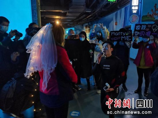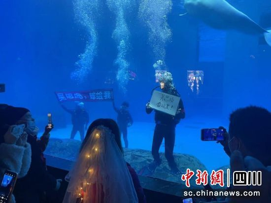 据了解,小吴为成都海昌极地海洋公园的白鲸保育员,两人因工作关系,在海洋公园相识、相交。他们在白鲸、海豚等海洋动物的见证下,结束了3年的恋爱长跑,准备携手进入人生新阶段。为了能够顺利完成求婚过程,小李经历了长达1个月的潜水训练,他不仅要克服水下阻力带来的影响,也要克服“深海恐惧症”的心理压力。对于这次成功的求婚,小李开心地称:“感谢大家一起见证了我们的爱情!在此,也祝天下有情人终成眷属!”(中新网)