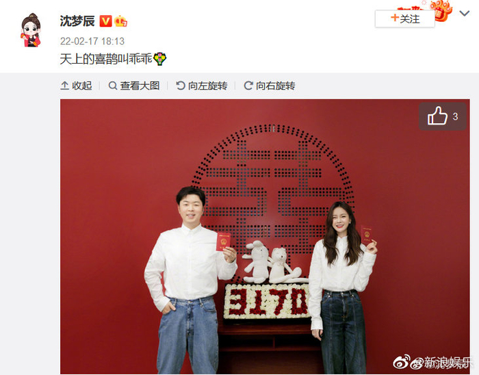#杜海涛沈梦辰结婚##杜海涛沈梦辰宣布结婚# 17日, @杜海涛@沈梦辰 官宣结婚,卡点沈梦辰生日“6:13”宣布。两人晒出结婚证以及结婚登记照,并配文:“天上的喜鹊叫乖乖”。2014年,两人同游韩国两人恋情曝光,到2022年经历9年爱情长跑。日前,有网友曝出他们在长沙开福区民政局领证。