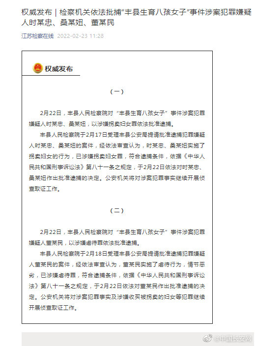 【#丰县八孩母亲案相关嫌疑人已被逮捕#】2月22日,江苏省徐州市丰县人民检察院对“丰县生育八孩女子”案犯罪嫌疑人时某忠、桑某妞,以涉嫌拐卖妇女罪依法批准逮捕。同时,对涉案犯罪嫌疑人董某民,以涉嫌虐待罪依法批准逮捕。安哥:彻查到底,依法严惩,政法君一直在路上!#丰县八孩母亲案省级调查组结果公布##丰县生育八孩女子事件调查和处理情况#