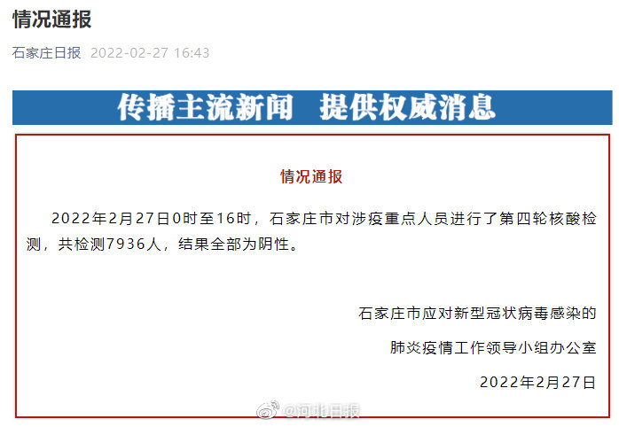 石家庄重点人员第四轮核酸检全部为阴性 河北日报 河北日报官方账号 2022.02.2717:02 关注 【#石家庄重点人员第四轮核酸检全部为阴性#】2022年2月27日0时至16时,石家庄市对涉疫重点人员进行了第四轮核酸检测,共检测7936人,结果全部为阴性。[编辑|李硕]