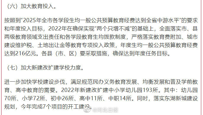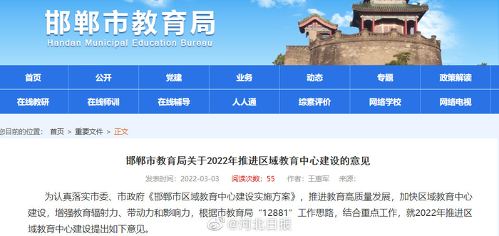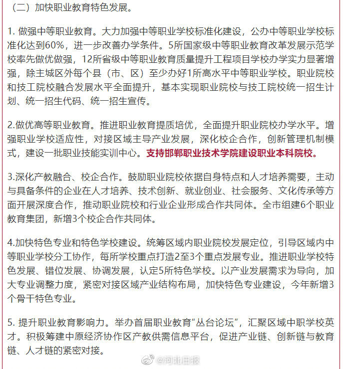 【最新意见公布!#河北这些院校将有大变化#】邯郸市教育局最新发布关于2022年推进区域教育中心建设的意见。意见提出,支持邯郸职业技术学院建设职业本科院校。河北工程大学硕士学位授权点达到30个以上,达到博士学位授予单位申请条件。立项建设马克思主义理论一级学科和体育硕士专业等学位授权点建设。水利工程学科列入新一期河北省一流学科建设项目。在国家新一轮学科评估中,2个以上学科达到C档。#支持邯郸学院建设邯郸师范大学#,积极申报硕士学位授予单位。凡在乡村学校任教累计满25年且仍在乡村学校任教的,可不受岗位职数限制,直接聘用到与其现有专业资格相对应的岗位。(河北日报记者赵红)[编辑|王伟]