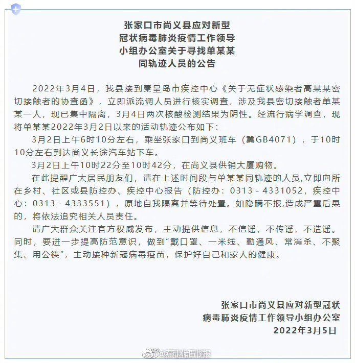 【#张家口尚义县公布一密接轨迹#,涉及班车、商厦】张家口市尚义县发布最新公告,2022年3月4日,我县接到秦皇岛市疾控中心《关于无症状感染者高某某密切接触者的协查函》,立即派流调人员进行核实调查,涉及我县密切接触者单某某一人,现已集中隔离,3月4日两次核酸检测结果为阴性。经流行病学调查,现将单某某2022年3月2日以来的活动轨迹公布如下: 3月2日上午6时10分左右,乘坐张家口到尚义班车(冀GB4071),于10时10分左右到达尚义长途汽车站下车。 3月2日上午10时22分至10时42分,在尚义县供销大厦购物。 在此提醒广大居民朋友们,请在上述时间段与单某某同轨迹的人员,立即向所在乡村、社区或县防控办、疾控中心报告(防控办:0313-4331052,疾控中心:0313-4333551),原地自我隔离并等待处置。如隐瞒不报,造成严重后果的,将依法追究相关人员责任。 请广大群众关注官方权威发布,主动提供信息,不信谣,不传谣,不造谣。同时,要进一步提高防范意识,做到“戴口罩、一米线、勤通风、常消杀、不聚集、用公筷”,主动接种新冠病毒疫苗,保护好自己和家人的健康。(大美天地 崇德尚义)