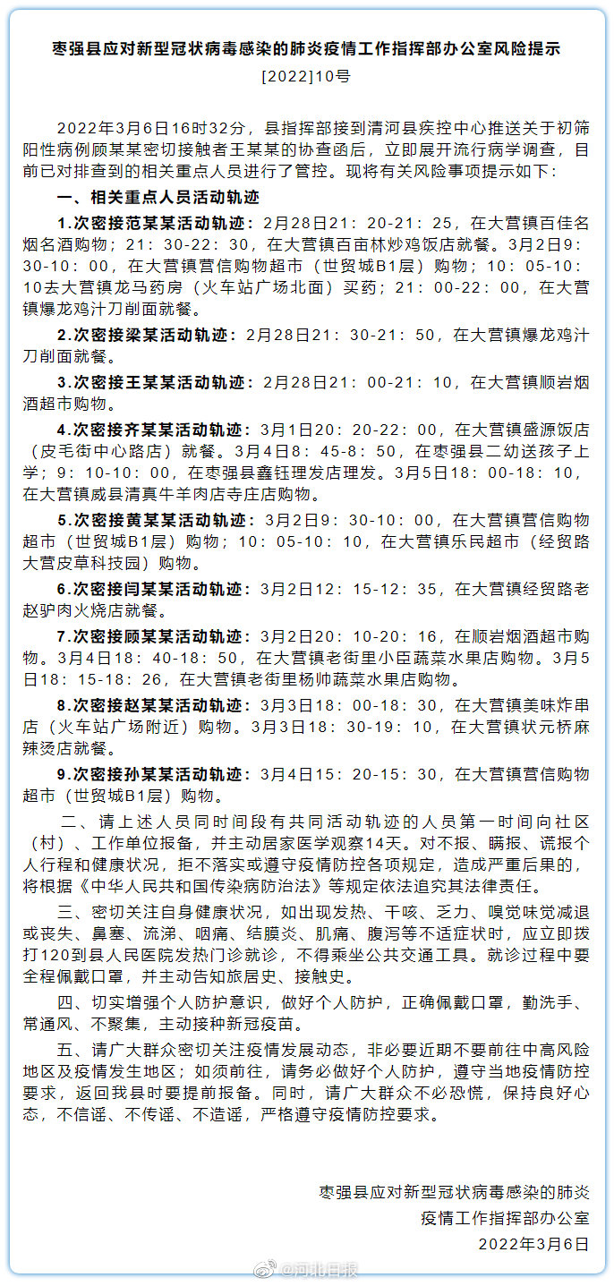 【#衡水枣强县公布9名次密接人员轨迹#,涉餐馆、超市、药房等】枣强县疫情办发布最新风险提示,2022年3月6日16时32分,县指挥部接到清河县疾控中心推送关于初筛阳性病例顾某某密切接触者王某某的协查函后,立即展开流行病学调查,目前已对排查到的相关重点人员进行了管控。现将有关风险事项提示如下: 一、相关重点人员活动轨迹 1.次密接范某某活动轨迹:2月28日21:20-21:25,在大营镇百佳名烟名酒购物;21:30-22:30,在大营镇百亩林炒鸡饭店就餐。3月2日9:30-10:00,在大营镇营信购物超市(世贸城B1层)购物;10:05-10:10去大营镇龙马药房(火车站广场北面)买药;21:00-22:00,在大营镇爆龙鸡汁刀削面就餐。 2.次密接梁某活动轨迹:2月28日21:30-21:50,在大营镇爆龙鸡汁刀削面就餐。 3.次密接王某某活动轨迹:2月28日21:00-21:10,在大营镇顺岩烟酒超市购物。 4.次密接齐某某活动轨迹:3月1日20:20-22:00,在大营镇盛源饭店(皮毛街中心路店)就餐。3月4日8:45-8:50,在枣强县二幼送孩子上学;9:10-10:00,在枣强县鑫钰理发店理发。3月5日18:00-18:10,在大营镇威县清真牛羊肉店寺庄店购物。 5.次密接黄某某活动轨迹:3月2日9:30-10:00,在大营镇营信购物超市(世贸城B1层)购物;10:05-10:10,在大营镇乐民超市(经贸路大营皮草科技园)购物。 6.次密接闫某某活动轨迹:3月2日12:15-12:35,在大营镇经贸路老赵驴肉火烧店就餐。 7.次密接顾某某活动轨迹:3月2日20:10-20:16,在顺岩烟酒超市购物。3月4日18:40-18:50,在大营镇老街里小臣蔬菜水果店购物。3月5日18:15-18:26,在大营镇老街里杨帅蔬菜水果店购物。 8.次密接赵某某活动轨迹:3月3日18:00-18:30,在大营镇美味炸串店(火车站广场附近)购物。3月3日18:30-19:10,在大营镇状元桥麻辣烫店就餐。 9.次密接孙某某活动轨迹:3月4日15:20-15:30,在大营镇营信购物超市(世贸城B1层)购物。 二、请上述人员同时间段有共同活动轨迹的人员第一时间向社区(村)、工作单位报备,并主动居家医学观察14天。对不报、瞒报、谎报个人行程和健康状况,拒不落实或遵守疫情防控各项规定,造成严重后果的,将根据《中华人民共和国传染病防治法》等规定依法追究其法律责任。 三、密切关注自身健康状况,如出现发热、干咳、乏力、嗅觉味觉减退或丧失、鼻塞、流涕、咽痛、结膜炎、肌痛、腹泻等不适症状时,应立即拨打120到县人民医院发热门诊就诊,不得乘坐公共交通工具。就诊过程中要全程佩戴口罩,并主动告知旅居史、接触史。 四、切实增强个人防护意识,做好个人防护,正确佩戴口罩,勤洗手、常通风、不聚集,主动接种新冠疫苗。 五、请广大群众密切关注疫情发展动态,非必要近期不要前往中高风险地区及疫情发生地区;如须前往,请务必做好个人防护,遵守当地疫情防控要求,返回我县时要提前报备。同时,请广大群众不必恐慌,保持良好心态,不信谣、不传谣、不造谣,严格遵守疫情防控要求。 #加油河北#(枣强融媒)[编辑|王伟]