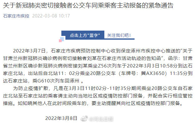 【#一密接者曾在石家庄乘坐20路公交车#,同乘乘客请主动报备】2022年3月7日,石家庄市疾病预防控制中心收到保定涿州市疾控中心推送的“关于甘肃兰州新冠肺炎确诊病例密切接触者刘某在石家庄市活动轨迹的告知函”,函示:甘肃省兰州新区确诊新冠肺炎病例密接刘某乘坐Z56次列车于2022年3月3日10:58分到达石家庄北站,出站后自北站11:02分乘坐20路公交车(车牌号:冀AX3650)11:35分到达石家庄站,乘G610次列车回涿州 。 为防止疫情扩散,凡是在3月3日11时02分-11时35分期间乘坐20路公交车自石家庄北站至石家庄站的乘客请主动向当地社区或疫情防控部门报备,并配合实行相应管控措施。如知晓其他人在此时间段乘车的,要主动提醒其向社区或疫情防控部门报备。来源|石家庄市疾控[编辑|李硕]