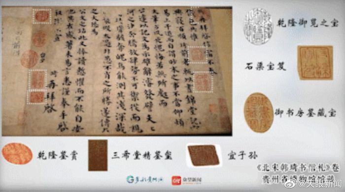 <韩琦楷书信札>及宋代文人风韵展》,来自贵博馆藏,为宋代名臣韩琦的孤本真迹,《北宋韩琦书信札》卷中的《信宿贴》曾被乾隆连赞6次。 据了解,在贵州省博物馆馆藏近5000余件卷轴书画中,《北宋韩琦楷书信札》卷内,创作于北宋时期的《信宿贴》与《旬日贴》,为韩琦现今唯一传世法书。 全长867.7厘米,横31厘米的《北宋韩琦楷书信札》卷,由韩琦《信宿贴》《旬日贴》与卷后11人的13段跋文组成。除韩琦真迹外,还包含北宋中期、元代中晚期、清代早期多个时代、多位历史名人的“点赞”和“长篇弹幕”,堪称“国宝综合体”。甚至可以说,任意截取一篇跋文,它的独立价值就能成为一座博物馆的“镇馆之宝”。 据介绍,《北宋韩琦书信札》卷中的《信宿贴》曾被乾隆加盖的6枚印,而盖印章,是古人鉴赏书画“点赞”的方式之一。(来源:众望新闻)