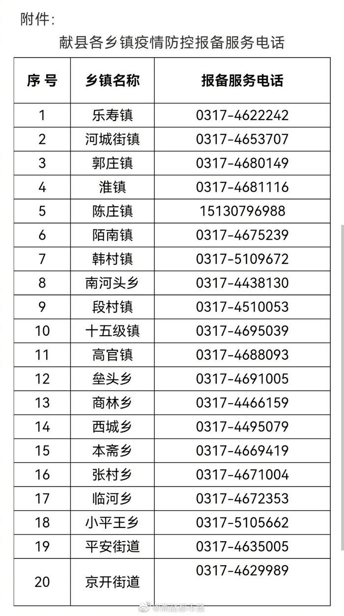 【沧州#献县发布自主申报通告#】献县广大群众: 凡2月20日后进出过沧县杜生盛丰塑胶制品公司,或与该公司有关人员接触过的人员,请立即主动向所在乡镇、村或社区包联单位、工作单位报备,主动配合做好筛查检测工作,并落实好各项防控措施,凡不如实报备行程,引发新冠肺炎疫情传播风险或其他严重后果的,将依法追究责任。广大群众如发现身边有以上相关人员没有主动报备的,请积极拨打所在乡镇举报电话或县防控办电话4620030进行举报。 附件:各乡镇报备、举报电话 献县新冠肺炎防控领导小组办公室 2022年3月11日(献县发布)