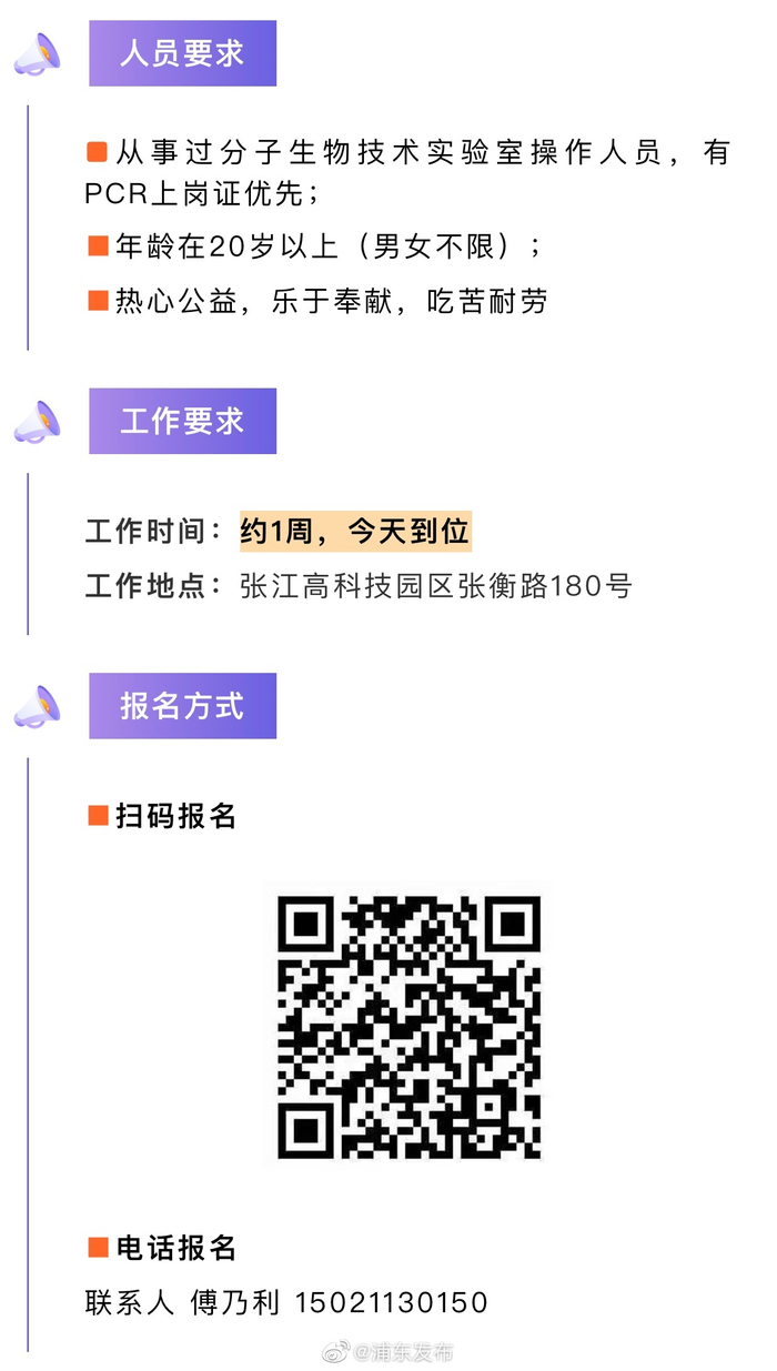 】 #上海加油##上海战疫# 根据市政府的紧急布署,为确保本市新冠核酸检测任务及时完成,现需要紧急招募30名工作人员,充实到浦东相关检测机构!详见↓#浦东城市服务台#