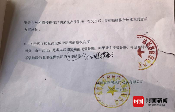 针对客厅楼板高度低于厨房地板高度,开发商则回复,此设计是考虑到后期装修便于装地暖,如果业主不装地暖,开发商也可以针对不装地暖的业主提供实际方便措施。