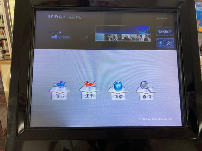 题图说明:一社区图书馆内自助借还设备。