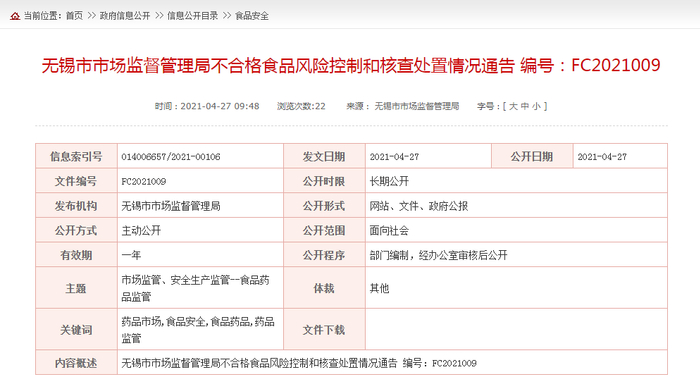 中国质量新闻网讯 2021年4月27日,江苏省无锡市市场监督管理局网站发布了不合格食品风险控制和核查处置情况通告(编号:FC2021009)。