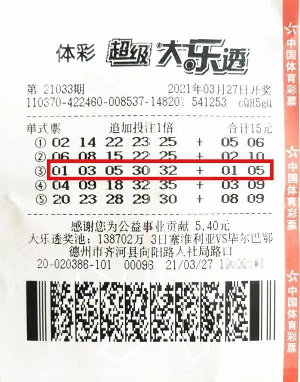 3月27日,大乐透第21033期开出号码:前区“01、03、05、30、32”,后区“01、05”。张先生购买的这张“6+3”复式票网中了当期所有开奖号码,中得一等奖1注奖金1000万,二等奖2注奖金492680元,四等奖5注奖金15000元,五等奖10注奖金3000元,单票共中奖金1051068元。