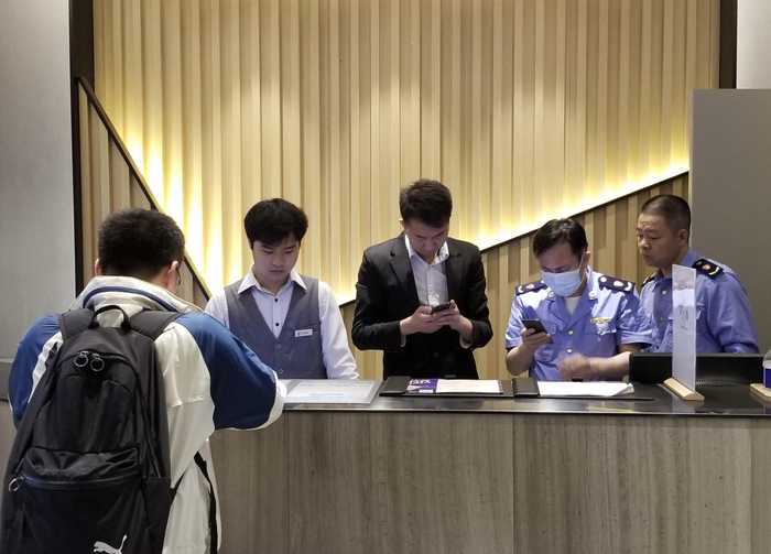 执法人员到酒店调查取证。