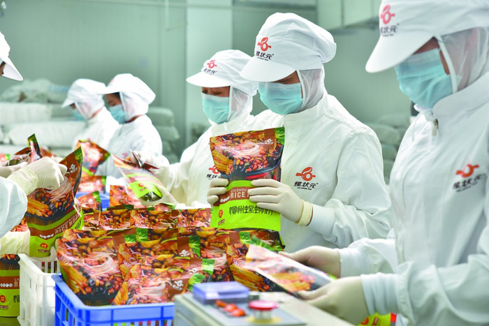 “刚开始有这种苗头的时候,我们就着手注册商标。2014年10月开始研发,2015年5月正式投产。”广西螺状元食品科技股份有限公司董事长刘清石告诉《环球时报》记者,2014年的速食螺蛳粉产业还处于萌芽状态,大都是无证小作坊在做,卫生条件不好,产品包装很简陋,而且保质期都在45天以内。“我们投入60万元科研经费跟四川大学一起搞研发,经过3个多月试验,用物理杀菌法,做到行业内第一家180天保质期。”产品上市第一年,日均产销量约1000包,今年已达到30万包,其中线上销售约占65%。据刘清石介绍,该公司设在柳州螺蛳粉产业园的第二代工厂规模是第一代厂的6倍,达1.5万平方米,机械化程度从40%提升到80%。