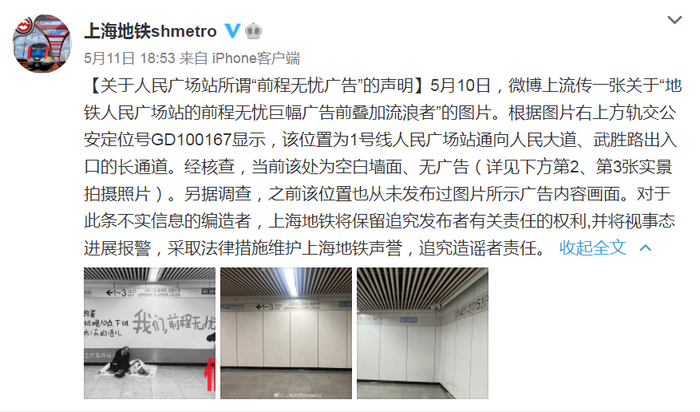 5月11日傍晚,上海申通地铁集团有限公司运营管理中心官方微博“@上海地铁shmetro”发文辟谣该处并未发布过这一广告,实为空白墙面。