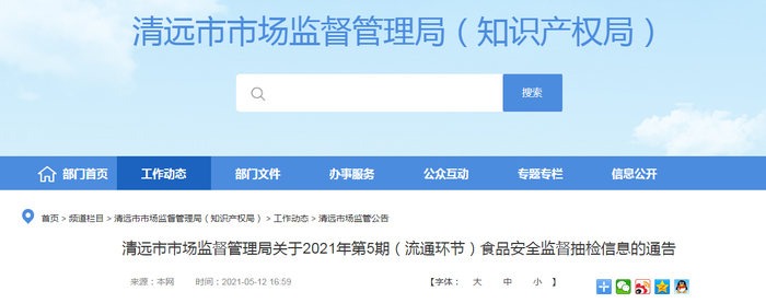 清远市市场监督管理局已要求辖区市场监管部门及时对不合格食品及其经营者进行调查处理,责令经营户采取下架、召回不合格产品等措施控制风险,并分析原因进行整改。