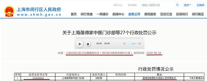 沪上此类“借中医药之名行违法违规之实”屡禁不止,关键恐怕还在于违法成本较低。如官方信息显示,“上海葆得家中医门诊部”在2019年9月10日因“未按规定填写病历资料”遭闵行区卫健委(区中医药发展办公室)行政处罚。2020年一年内又遭3次行政处罚。根据行政处罚决定书文号“闵第2220200020号”,记者发现“上海葆得家中医门诊部”因“使用未取得处方权的人员开具处方”仅遭罚款1200元。