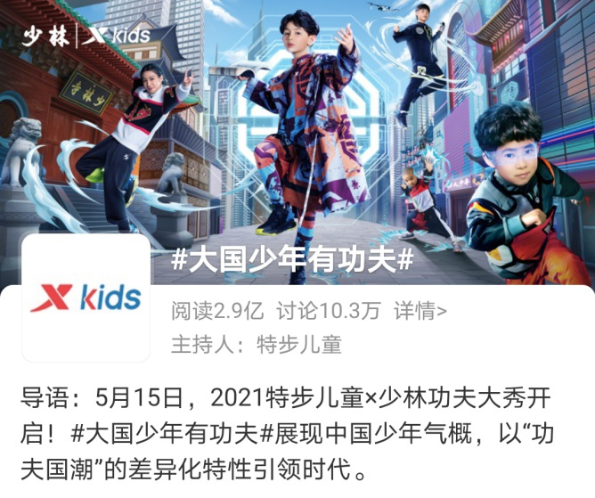 少年强则国强,大国少年是国之希望,国之未来。近日,特步儿童的一场少林大秀出现在娱乐新闻扎堆儿的微博热搜中。