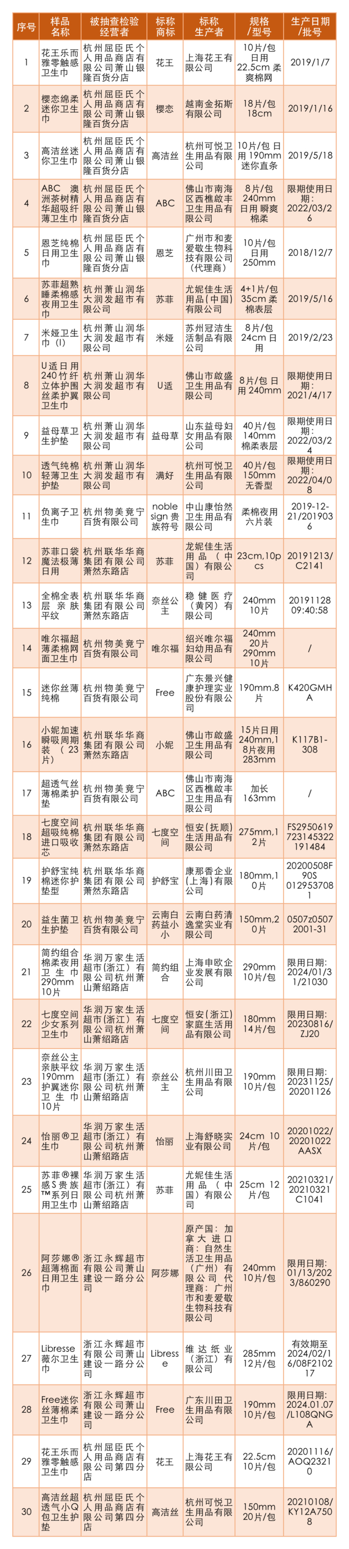 中国消费者报杭州报道 (记者郑铁峰) 市面上让人眼花缭乱的女性卫生护理用品,到底哪个更舒适?哪个更安全?近日,为保护广大女性消费者合法权益,引导大家放心购买女性卫生护理用品,浙江省杭州市萧山区市场监管局对全区范围内大型商超、专卖店销售的30批次流通领域女性卫生护理用品进行了产品质量监督抽查,其中包括苏菲、七度空间、花王、益母草、ABC等品牌。