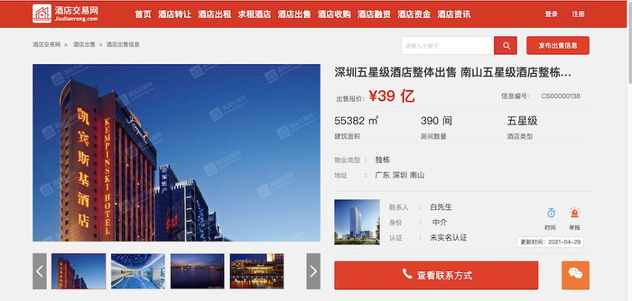 第一财经记者进一步采访和查询酒店交易网等平台后发现,全国各地都有不少五星级酒店项目“待嫁”。比如深圳南山五星级酒店整栋出售,客房数量324间,售价27亿元;同样在深圳南山,390间客房的五星级酒店整体出售,项目配图可见是凯宾斯基,售价39亿元;此外还有148间客房的佛山五星级酒店出售,项目配图可见是希尔顿欢朋;湖南张家界永定五星酒店整体出售,客房300间,售价1.61亿元。