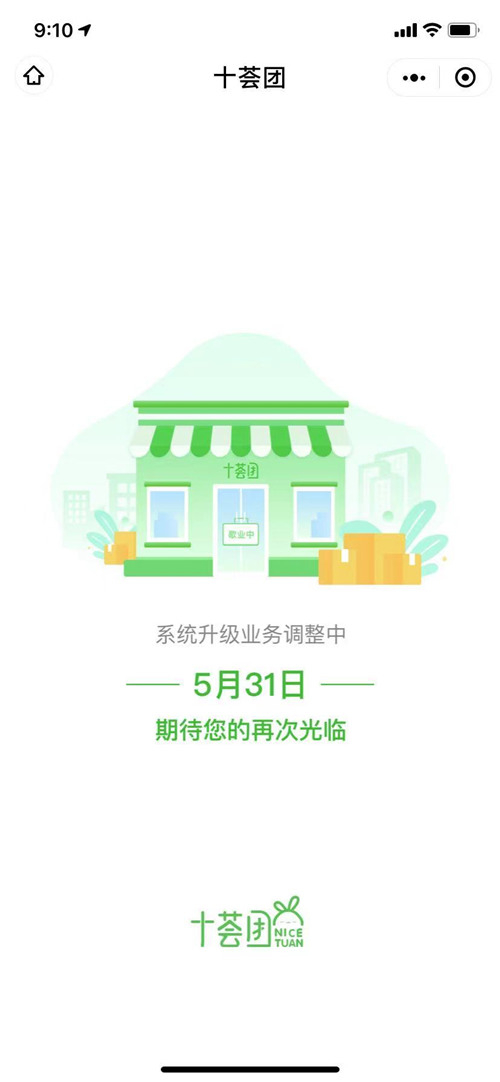 5月28日0时19分,记者注意到,定位在江苏部分区域的十荟团小程序页面已无产品信息,页面显示“系统升级业务调整中,5月31日期待再次光临”。