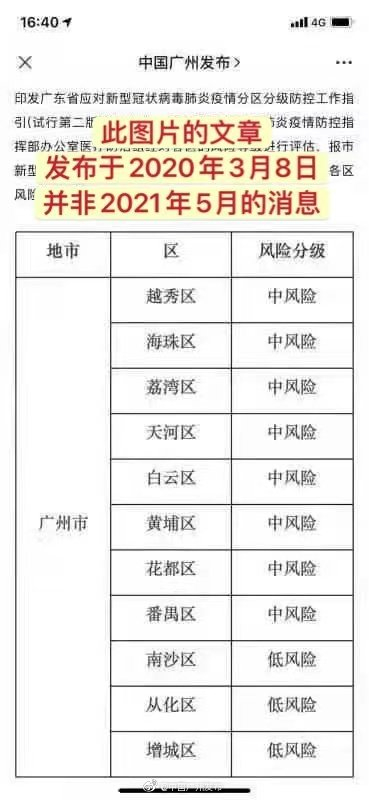 据广州市互联网信息办公室官方微博“@中国广州发布”5月26日通报,所谓“广州市中风险地区”的图片其实发布于2020年3月8日,并非2021年5月,该图片不是近期的风险等级。