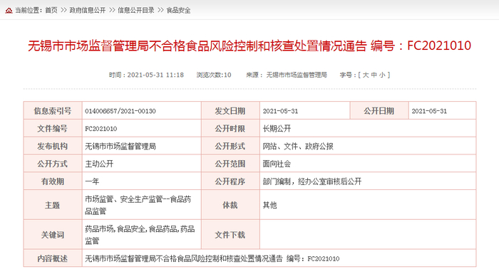 中国质量新闻网讯 近日,江苏省无锡市市场监督管理局发布不合格食品风险控制和核查处置情况通告 编号:FC2021010。