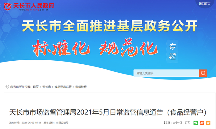 中国质量新闻网讯 安徽省天长市人民政府网站6月9日发布市市场监督管理局2021年5月日常监管信息通告(食品经营户)。