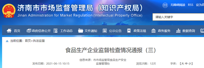 中国质量新闻网讯 近日,济南市市场监管局发布食品生产企业监督检查情况通报(三)。通报称,2021年6月4日,该局执法人员对济南齐旭实业有限公司采取“四不两直”方式进行监督检查。济南齐旭实业有限公司,地址:济南市天桥区北郊林场西邻齐旭路1号,生产许可证编号:SC10237010506760,主要生产类别:食用油、油脂及其制品。检查内容:生产环境条件、原辅料储存和生产过程控制。检查结果:该企业存在违反《食品安全法》《食品生产经营日常监督检查管理办法》的情况,目前已移交当地监管部门按照有关法律法规进行行政处罚及处理。