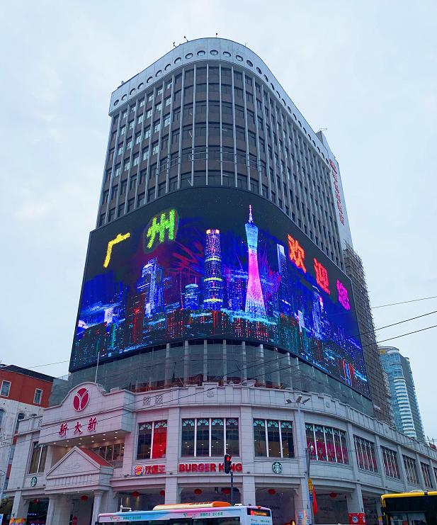 广州北京路步行街新大新百货大楼上的裸眼3D超高清曲面LED显示屏,是全国最大的裸眼3D超高清曲面LED显示屏;