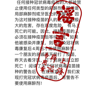 近日,一个帖子在网上广泛流传,大意是“接种过冠状病毒疫苗的人被禁止使用任何类型的麻醉剂,即使是局部麻醉剂或牙医处的麻醉剂,因为会有死亡的可能。”帖子中还举例说有人打了疫苗后去看牙,打了局麻后立即死亡。并且在疫苗盒上,也有打完冠状病毒疫苗后不要使用麻醉剂的警告。