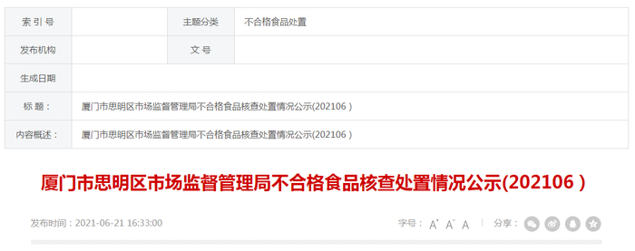 原标题:厦门市思明区市场监督管理局公示不合格食品(大黄瓜鱼)核查处置情况