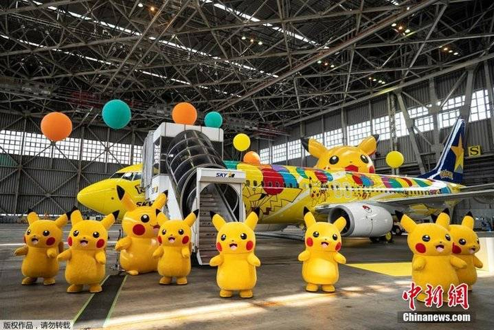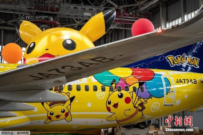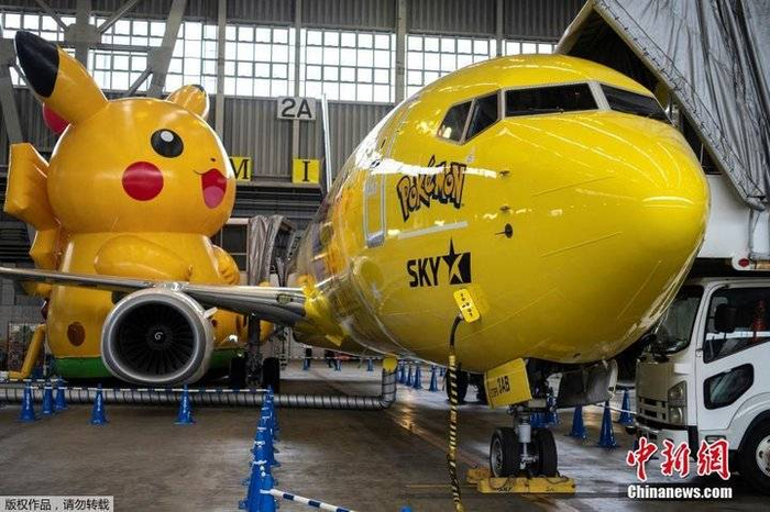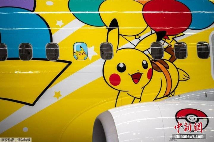 当地时间、6月21日,日本东京,日本天马航空公司打造出一架皮卡丘主题的涂装客机波音737-800,其机身绘制了皮卡丘图案,意在将欢乐带向天空。