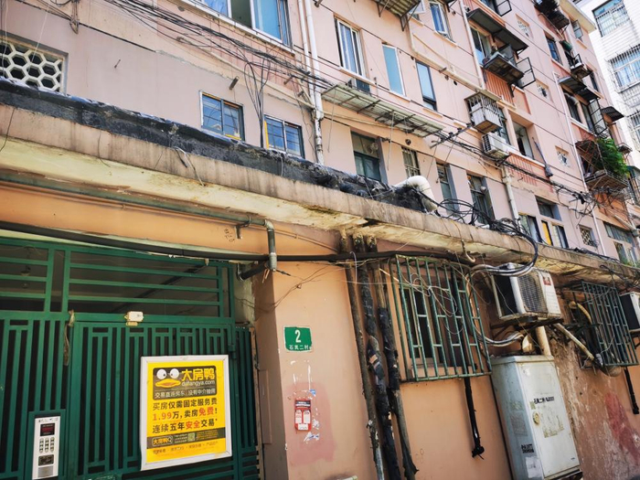 石岚二村位于普陀区石泉路和岚皋路口西北角。紧挨着石泉路的一排楼共计6层,1层为沿街商铺,2至6层为居民住宅。张先生经营着其中一间服装店。