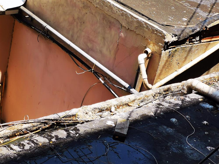 为什么不直接一根管道接到地面,而要将水管出口设在屋顶平台多此一举呢?张先生介绍,早前,1楼楼顶被楼上居民占用,搭建过违法建筑,后来“五违四必”整治行动拆除了违法建筑,但管道并未彻底拆除干净,2楼用户的水直接通过自设的管道流到屋顶上,屋顶一度积水严重,商铺内多处渗水。为此,底楼商铺还特意重新铺设了防水层。没想到,这次竟然直接漫出了屋顶。