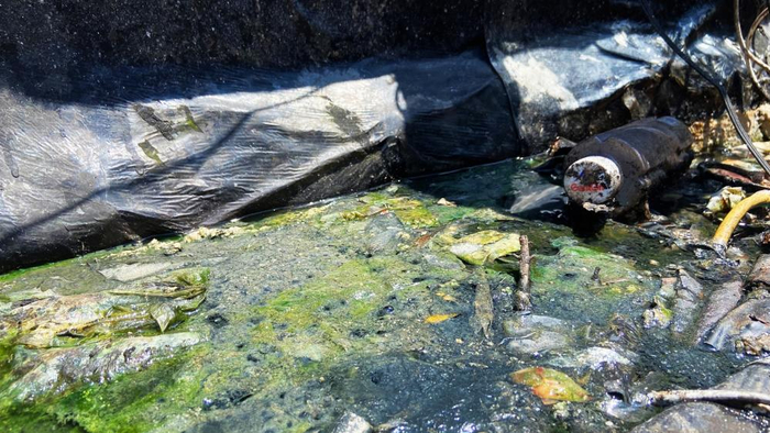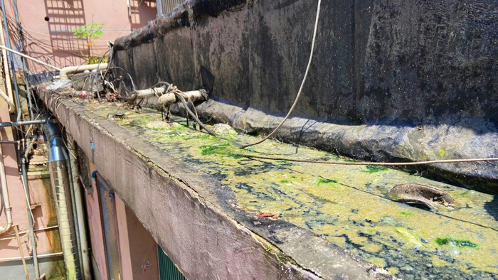 记者从2楼走廊里的窗户得以窥见商铺楼顶全貌。在靠近2楼居民这一侧,屋顶明显可见已经铺设了黑色的防水材料;靠近屋檐一侧,隐约可见一条沟槽。沟槽内积满了墨绿色的水,还隐约可见少量垃圾。张先生展示的图片更为直观,塑料袋、矿泉水瓶、绿藻、黑水混在一起,直让人犯恶心。