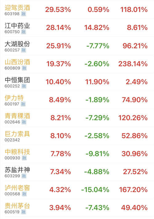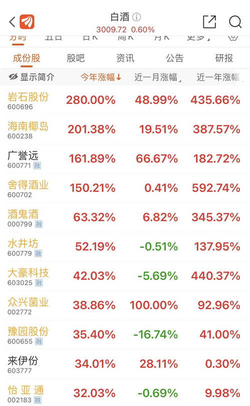 具体来看,今年上半年,40只白酒概念股,共25只个股股价上涨,4只个股涨幅超100%,2只个股涨幅超200%,其中,涨幅最高的为岩石股份,涨幅达280%。