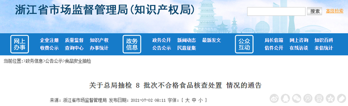 原标题:浙江省市场监管局关于不合格蓝莓李果(凉果类)的核查处置情况