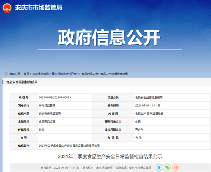原标题:安徽省安庆市市场监管局2021年二季度食品生产安全日常监督检查结果公示