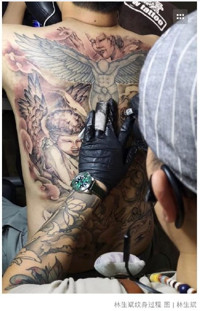 林生斌曾公布过一张背上有妻儿文身的照片,以作纪念。但近日有网友称“文身图案被烟雾火焰缭绕,最上面是个低头无面的黑色大天使,不是祈福或者纪念”。