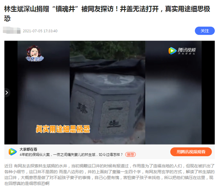当年捐水井时,林生斌被网友称赞为乐于助人、积德行善;而近日,网友们却将这口水井解读为“锁魂井”,说是“为了镇住孩子的亡灵”,理由是“井口‘童臻一生’字样倒过来念是‘一生镇童’,就是要镇住儿童”“水井深181米,是要把老婆孩子打入十八层地狱”“井两侧刻着莲花,莲花也是镇魂的”“井是八角的,这叫八卦井,很邪”“井是盖住的,不能取水”……