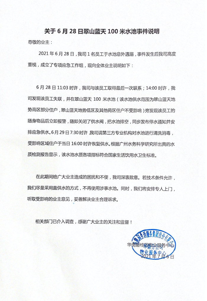 原标题:陷员工溺水风波一周后,碧桂园服务回应:当日即停水并安排应急供水